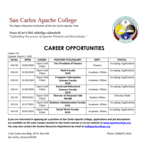 San Carlos Apache College is always seeking amazing adjunct faculty members to teach courses in a variety of academic disciplines as well as courses for personal enrichment.